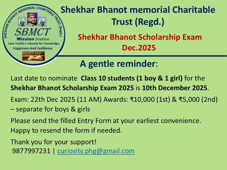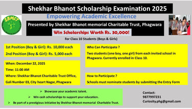 The Shekhar Bhanot Scholarship Examination 2025 is going to be organised at SBMCT Office, Phagwara on 22nd December 2025 to encourage academic excellence and to support deserving Class 10 students through merit-based scholarships.